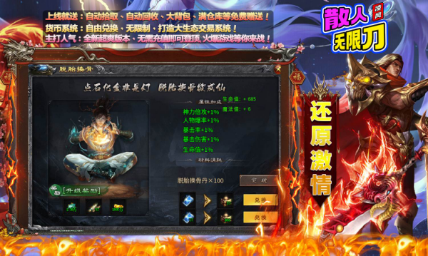 1、无限刀攻速系统,突破传统攻速上限,通过装备叠加和技能buff可实现极致攻击频率,刀光剑影特效满屏,体验割草般爽快战斗。