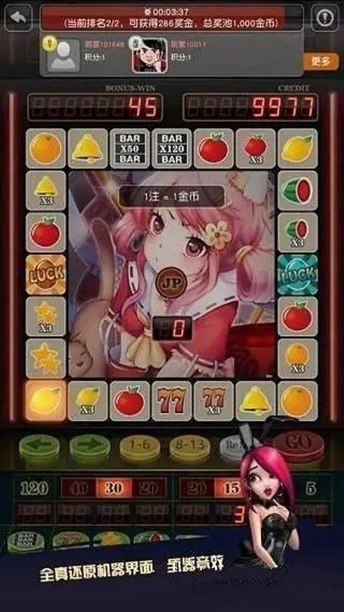 玩家进入游戏需要用金币换取分数,玩家点击某个押注物品则在该物品上使用分来下注。点击开始则游戏 77、双星、BAR。